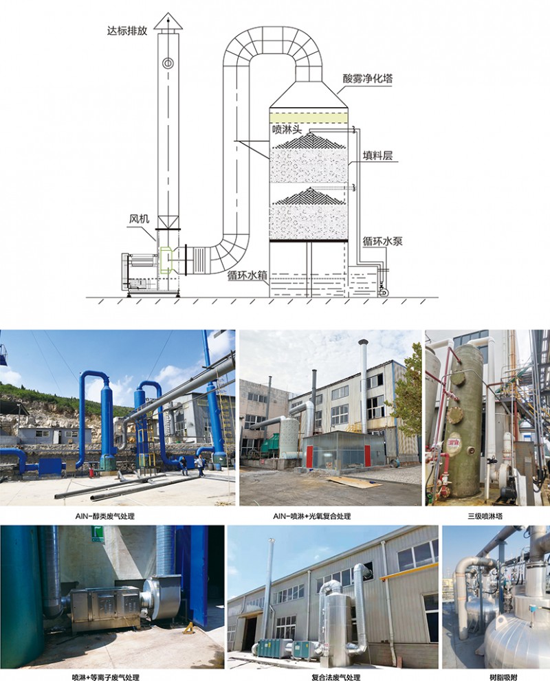 廢氣凈化噴淋塔主要的運作方式是廢氣由風管引入凈化塔,經(jīng)過填料層,廢氣與氫氧化鈉吸收液進行氣液兩相充分接觸吸收中和反應(yīng),廢氣經(jīng)過凈化后,再經(jīng)除霧板脫水除霧后由風機排入大氣。吸收液在塔底經(jīng)水泵增壓后在塔頂噴淋而下,回流至塔底循環(huán)使用。凈化后的廢氣達到地方排放標準的排放要求,低于國家排放標準。